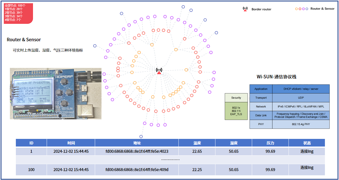 如下图所示,为持续提升Wi-SUN产品性能,玖鼎微在实地部署了一个具有一定规模的Wi-SUN(FAN)网络,以实现对其通信性能的有效把控。现阶段,该网络已充分验证了上百个Router Node的互联互通,可对Leaf Node的温度、湿度与气压数据进行实时采集,并通过Border Router网关协议将这些环境数据实时上传至后台无线组网数据平台或云端控制系统中。