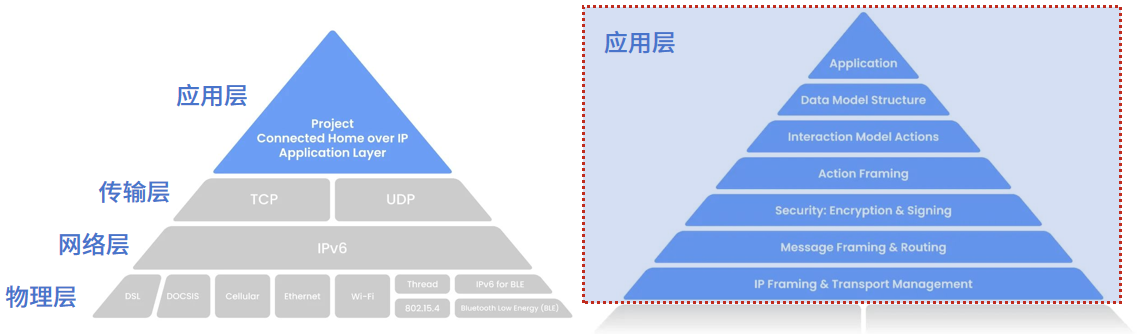 如上图所示,通过在应用层上规定统一的技术规范,Matter标准可帮助消费者轻松地实现跨品牌设备间的联动控制(如在一个家居生态APP上统一调控不同品牌的智能灯具、家电设施等),提升智能家居系统的互操作性、安全性和体验性。