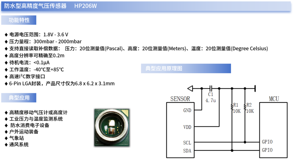 例如,玖鼎微自主研发的HP206W就是一款可同时精确提供气压、温度与高度数据的,带I²C接口的防水型高精度数字气压传感器。