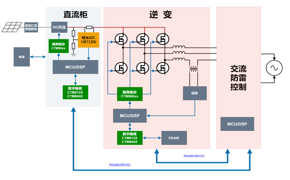 例如,在玖鼎微为光伏系统所提供的数字隔离解决方案中,CMT812x、CMT804x等数字隔离芯片被应用于MCU/DSP与串行总线(RS485/SPI/IIC)之间时,可消除接地环路、阻断共模噪声(如功率开关器件产生的高频噪声)通过地线或信号线耦合到通信链路,确保数据通信的稳定性(如采样数据、控制指令的准确交互)。