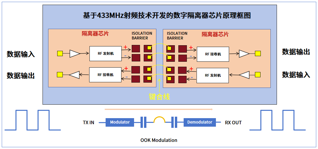 其中,在数字隔离器领域,玖鼎微产品主要基于433MHz射频技术开发,并采用了经典的OOK调制方案,其本质是一种具备微型无线射频收发系统的芯片。