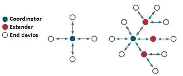 如下图所示,RFM23A020支持构建一个Sub-GHz频段下的无线数据双向通信网络,该网络基于Connect私有协议,可由一个中心节点和若干个中继节点及终端节点组成星型网络或扩展星型网络拓扑;其中,中心节点负责网络子节点地址分配和管理,最多可支持64个子节点加入网络;中继节点负责扩展网络覆盖范围,最多支持32个子节点加入网络;终端节点则可分为普通终端节点和支持低功耗的休眠节点。