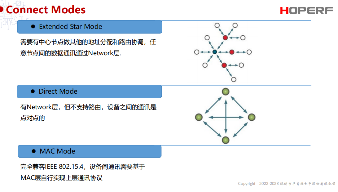 值得一提的是,除上述Extended Star Mode外,RFM23A020还支持Direct Mode和MAC Mode两种组网方案,不仅适合应用在多节点、需集中管控的组网场合中(由中心节点统一调度设备间的通信路径),还适合应用在简单的直连场景(无需路由,少量节点直接通信)及其低功耗的自组织网络中(利用802.15.4的MAC层实现简单交互),极具灵活性。