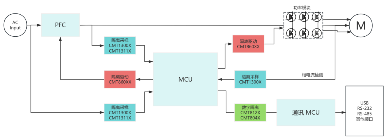 如上图所示,在玖鼎微为变频器所提供的电气隔离方案中,CMT860XX等隔离驱动芯片可应用在系统主控MCU与功率管(MOSFET/IGBT)之间,能有效防止高压窜入控制侧损坏敏感元件,同时放大PWM控制信号以提供足够驱动电流,适配宽禁带半导体的高频开关需求,且其还集成了失效防护机制,可保障变频器电路的高效、可靠运行。