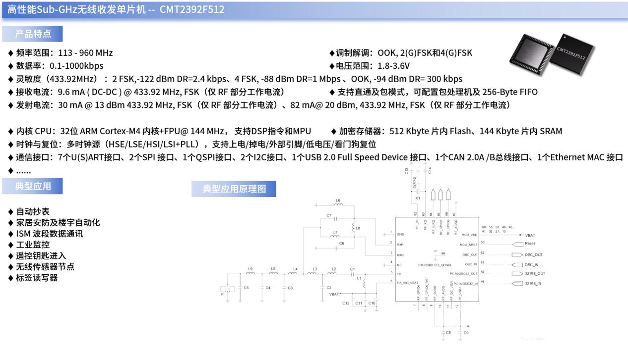 例如,CMT2392F512就是一款玖鼎微自主研发的高性能Sub-GHz无线收发单片机,其内部集成32位ARM CortexTM-M4F内核和一颗超低功耗Sub-GHz射频收发器,支持OOK、2(G)FSK、4(G)FSK等调制方式,可工作在113~960 MHz频段范围内,并拥有+20dBm的发射功率和-122dBm的灵敏度,支持多种数据包格式及编解码方式,使得它可以灵活地满足各种应用的需求。