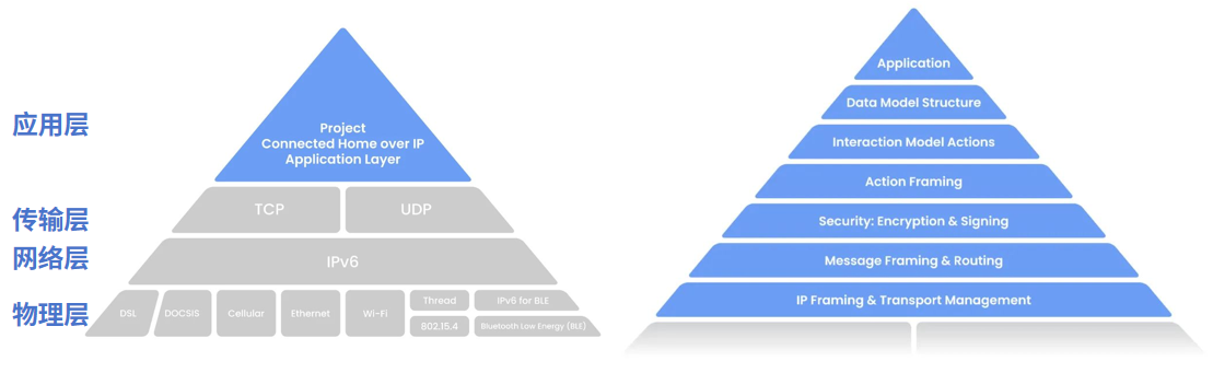 Matter协议基于IP架构,仅定义应用层标准,主要依赖支持IPv6的网络层和传输层进行数据传输。在此架构下,Matter底层网络可完美兼容Wi-Fi(高带宽)、Thread(低功耗网状网络)与以太网等IP协议,并可通过Matter Bridge桥接Zigbee、Z-WAVE与蓝牙等非IP协议。